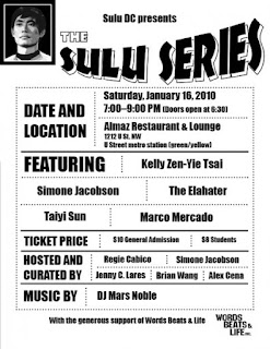 Sulu DC is an underground, grassroots network for Asian American and/or Pacific Islander American (AAPI)* artists, which provides a home for AAPI focused spoken word and multidisciplinary artists in Washington, D.C. Sulu DC fosters relationships with local and national activist organizations, nurtures the artistic development of emerging AAPI artists and builds inter-generational alliances with cities across North America in preparation for the biennial APIA Spoken Word & Poetry Summit (next summit: 2011 in Twin Cities, MN. Visit www.apiaword.com for more information).